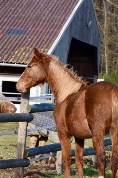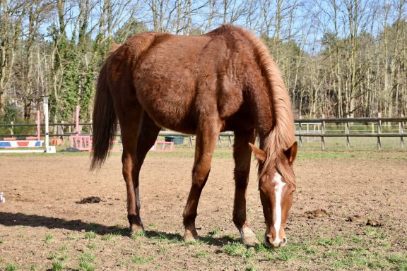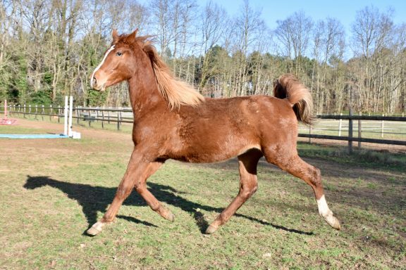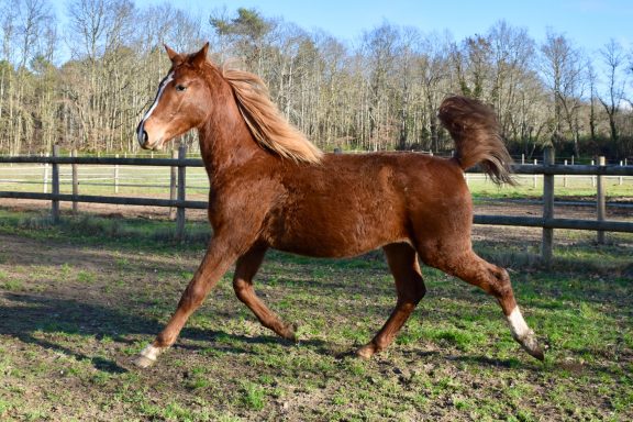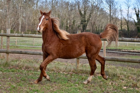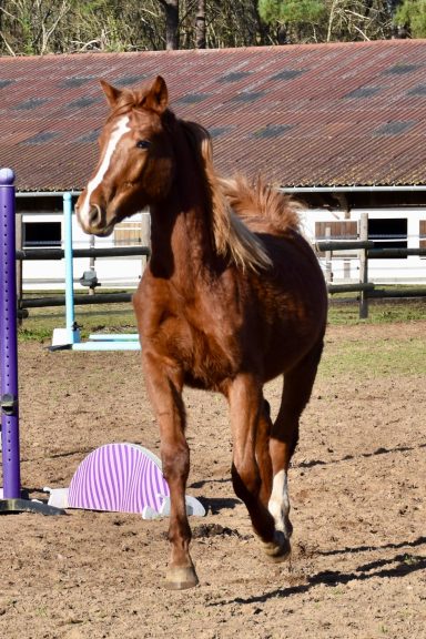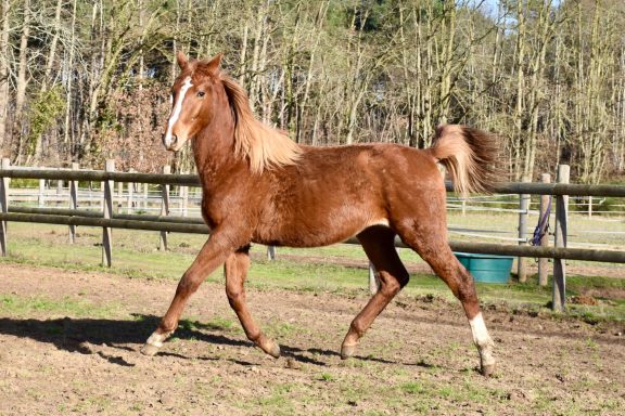 Pouliche très proche de l'homme et peu émotive. Un caractère en or.